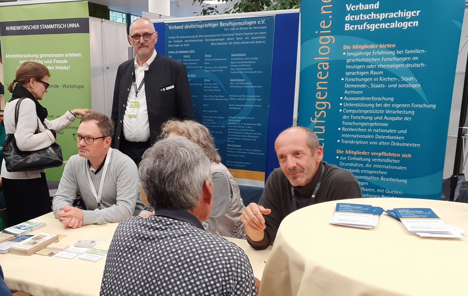 Beratung am Stand des Verbands deutschsprachiger Berufsgenealogen mit Markus Schönherr (Wien) und Bernhard Ullrich (Pfalz und Hessen)