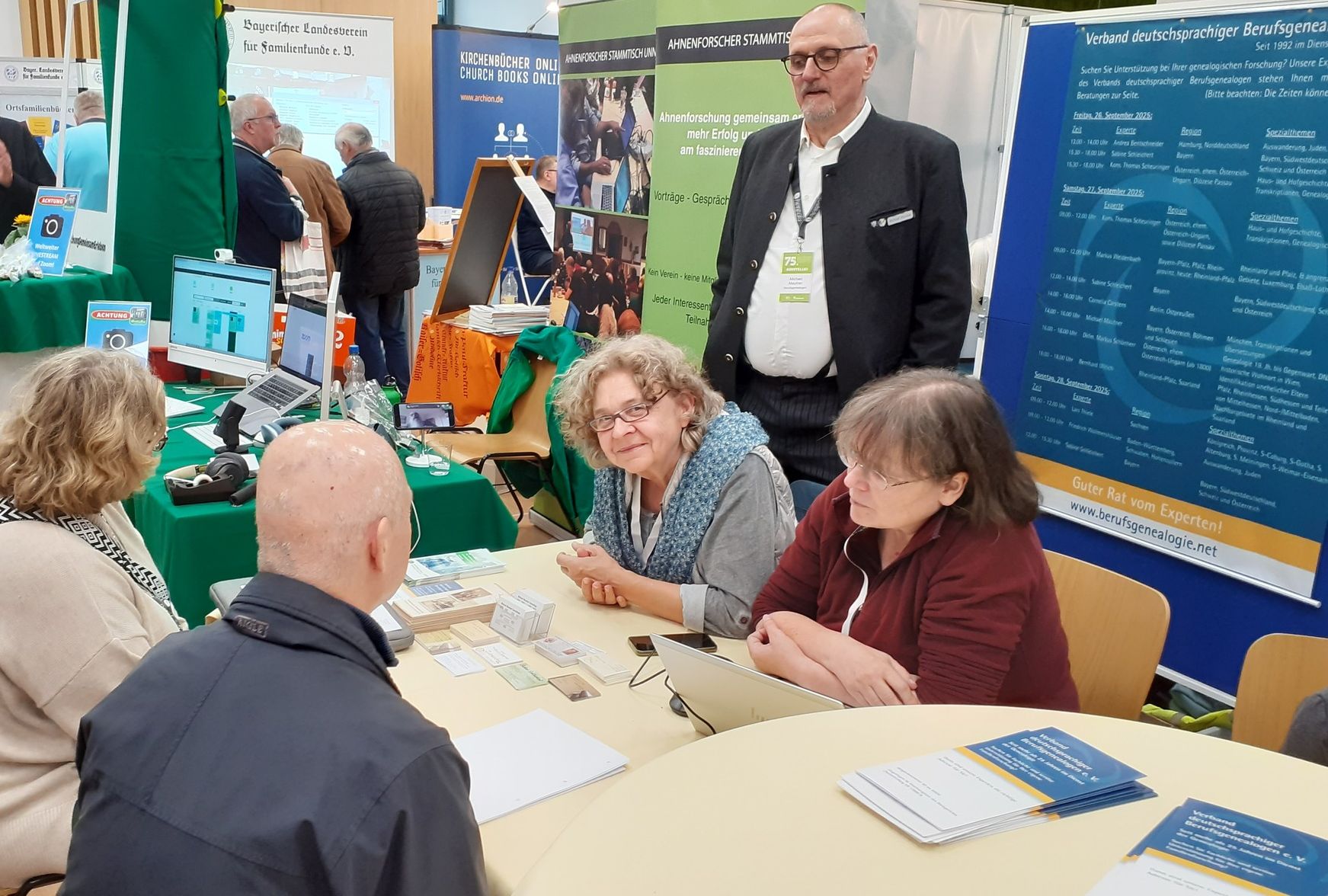 Beratung am Stand des Beratung am Stand des Verbands deutschsprachiger Berufsgenealogen mit Andrea Bentschneider (Hamburg) und Thomas Scheuringer (Österreich) mit Cornelia Carsten (Berlin, Brandenburg und Ostpreußen) und Sabine Schleichert (Bayern und Österreich)