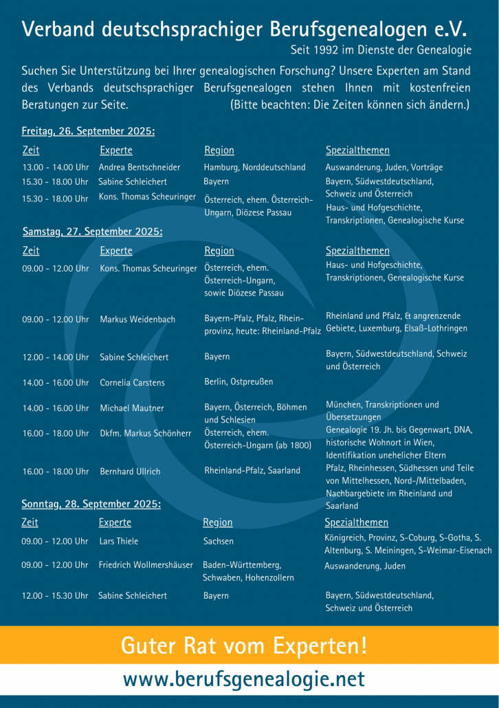 Beratungsangebot am Stand des Verbands deutschsprachiger Berufsgenealogen