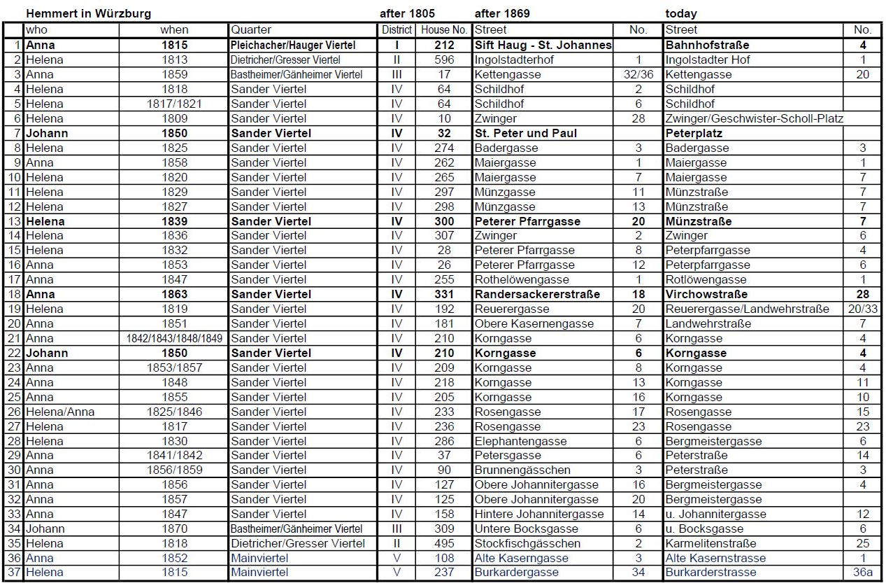 Wir konnten die historischen Hausnummern, die aus Tauf- und Sterbeurkunden in den Würzburger Kirchenbüchern und aus Einwohnermeldeformularen im Würzburger Stadtarchiv bekannt sind, in eine Tabelle übertragen. So konnten wir sie ihren heutigen Standorten zuordnen und sicherstellen, dass wir die richtigen Orte identifiziert hatten.