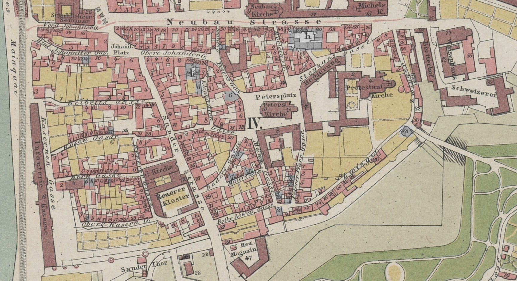 Quelle: MDZ Neuester Plan der Kreishauptstadt Würzburg : mit Angabe der neuen Hausnummern; entworfen und ausgeführt, mit Benutzung amtlicher Materialien, von L. Stürtz